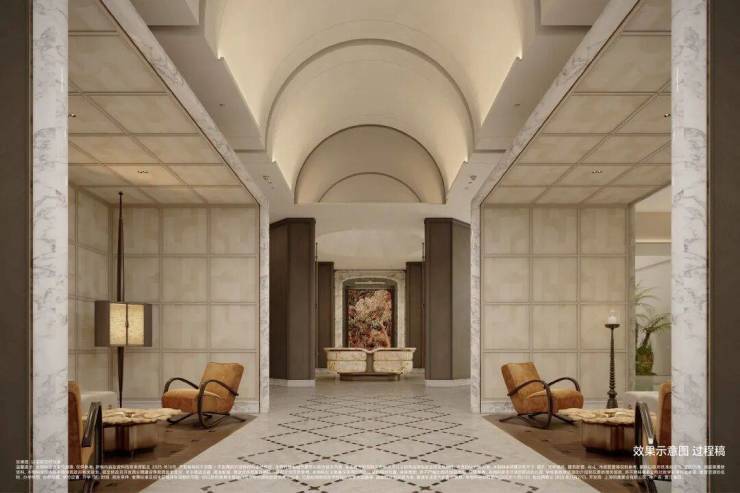 小区采用全人车分流设计,主入口位于西侧佑仁路,通行便捷有序。大门庄重大气,门头通过横向感拉槽与奢石景墙巧妙结合,搭配序列感植物,营造秩序感与昭示性。主入口三进式礼序,仪式感与功能性兼备。一进为酒店式落客和车马厅,以礼遇之姿迎接业主归家,大堂尽显尊崇;二进静谧水院、会客廊架、下沉庭院相互呼应,形成意境洄游空间;三进风雨连廊相伴,带来伴水归家惬意体验。次入口在东侧,方便出行。