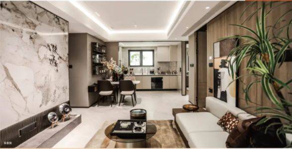 豪华颜值——全屋优质墙布,调配600*1200大面积地砖,将奢雅质感融入到方寸之中,详尽打造美的冷艳;创变乳胶漆+部分石膏板吊顶天花板、定制潘多拉艺术岩板背景墙,充溢张力的空间,与线条相映成辉。